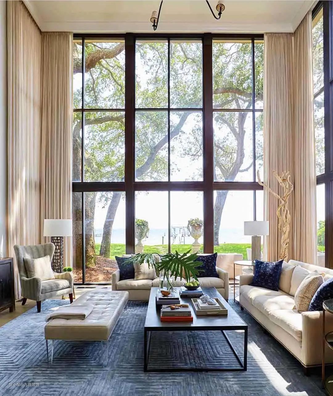 以前的落地窗是豪宅标配,现在越来越多人选择落地窗设计,风格立马变得高级。将落地窗与客厅结合,采光大大增加,小户型也显得更大。