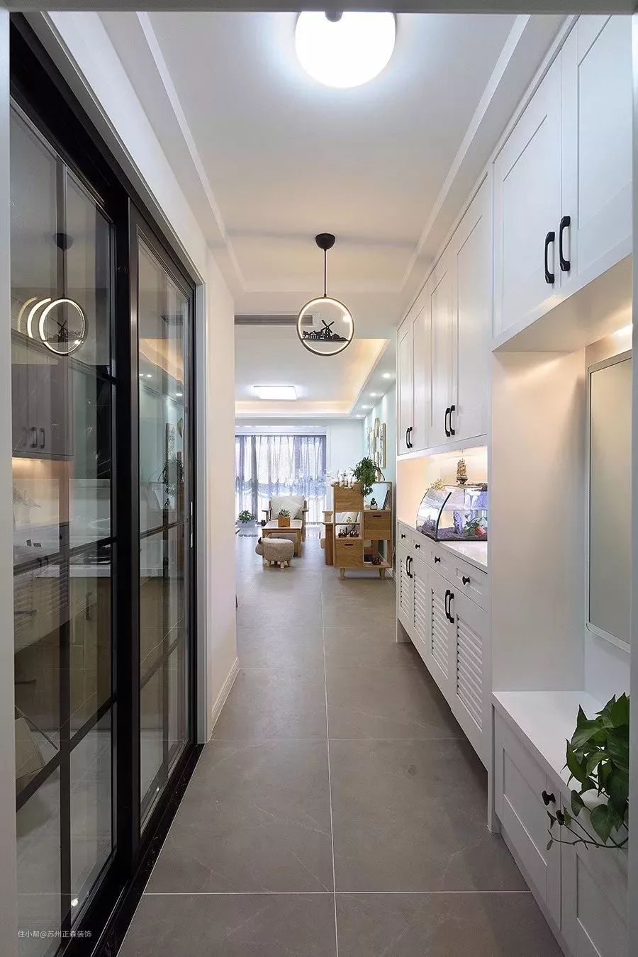 玄关走廊的吊顶设计,一般是根据整个新房装修风格走的。比如现代轻奢、现代美式风格玄关走廊的吊顶,可以做一些简单的装饰线条,吸顶灯精致小巧做搭配,气质立马就凸显出来。