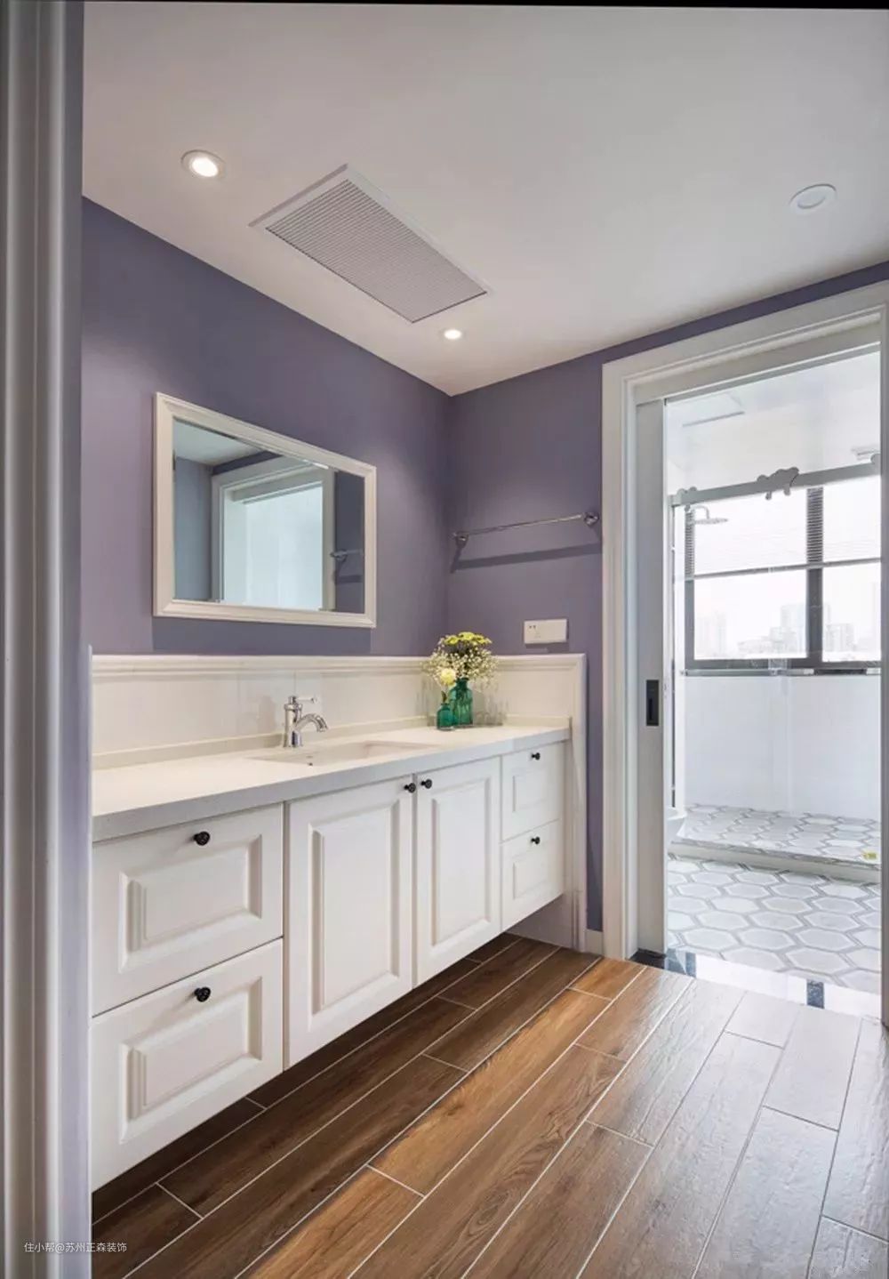 卫生间专门隔出一个洗漱区,这个干区的吊灯,通常做成简单的吸顶灯,不需要过于明亮的灯光。