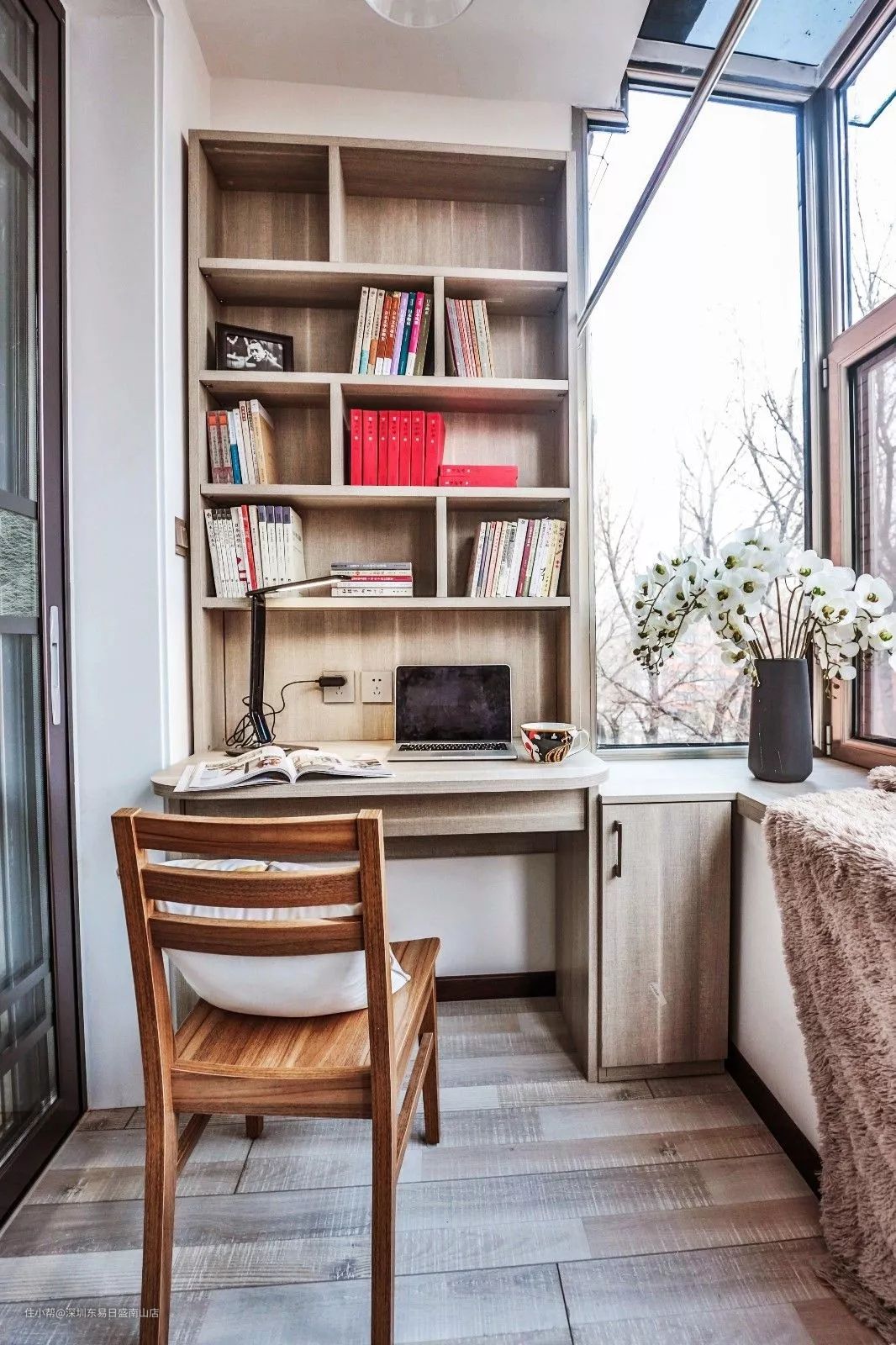 另外,还可以把卧室阳台设计成书房,营造一个安静的学习氛围。