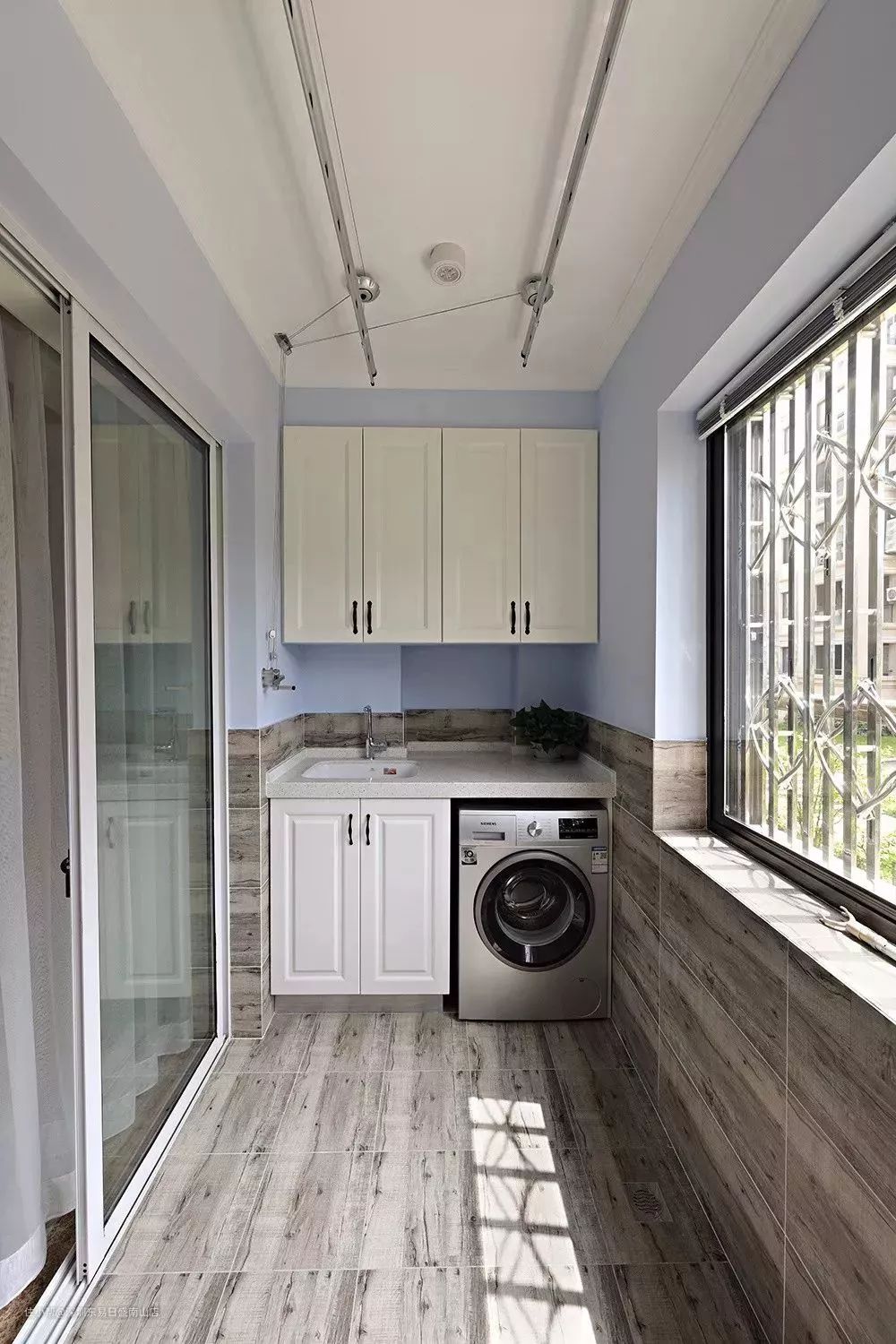 卫生间放不下洗衣机,只能挪到阳台上,洗衣柜+吊柜+(电动)晾衣架可以打造出一个超便利的洗衣房。