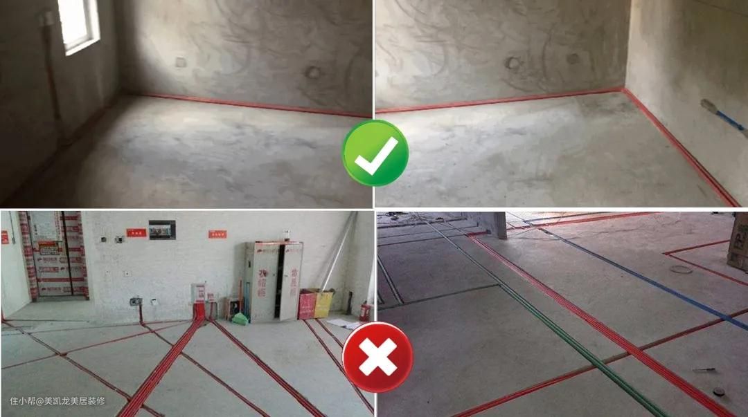 水电线管最好紧靠墙角进行暗埋,不能“点对点”横穿地面布线,水电线,被上面的地暖烤着,不坏都难!