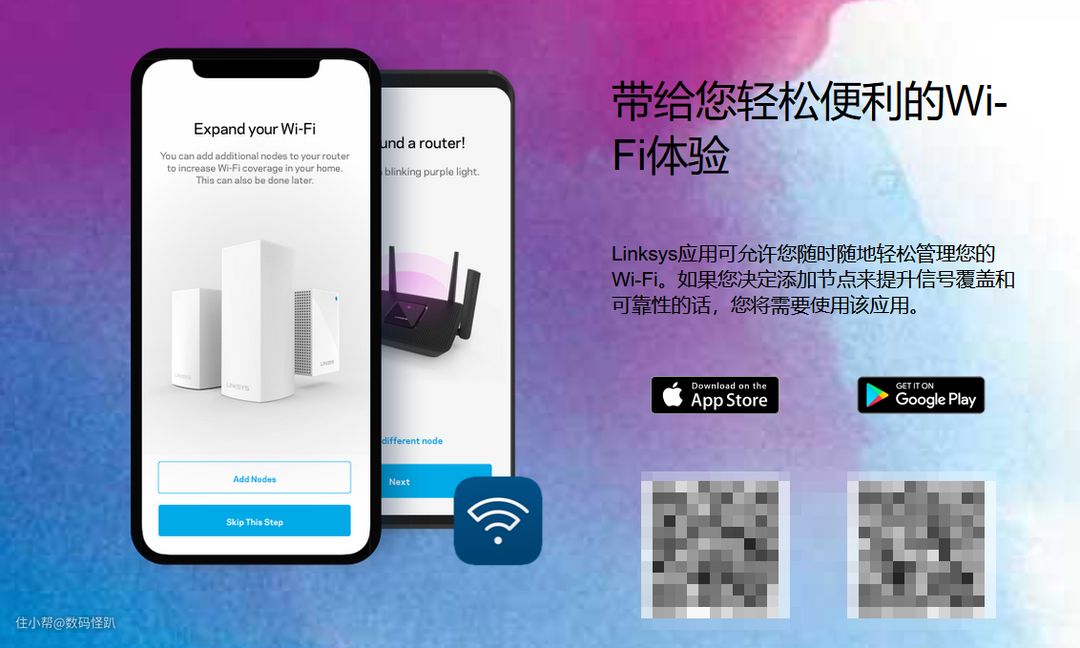 在开始组网前,需要先安装Linksys APP,扫码或各大应用市场搜索下载都可以,完成安装,没有帐号的注册一个,有的话直接登陆,下面这个是登陆后的Linksys APP的主界面及左侧的下拉菜单,功能和网页端基本是一样的,我们这里需要用到的是下拉菜单到底后的设置新产品选项。