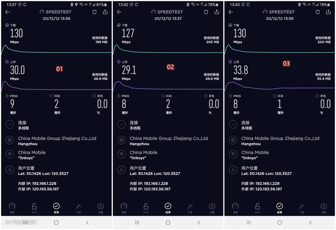 Wi-Fi热点选择的MX5300的5G频段,1、2、3三个点,上传下载速度都比较接近,延迟、抖动及丢包都比较理想。