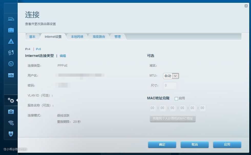 接着设置Intemet设置,在用户名及密码中输入营运商提供的帐户名称及密码,实际确认了这一步后,领势MX4200就能正常上网工作了,特别简单。