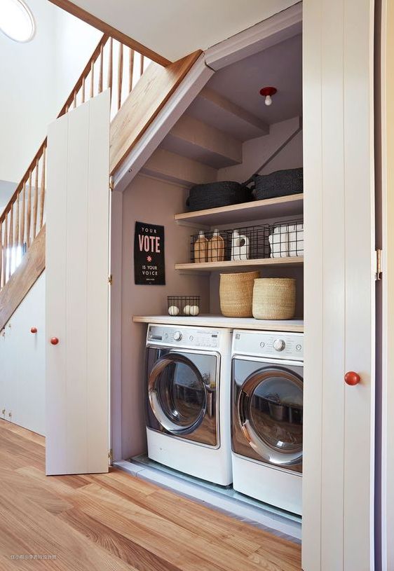 对于LOFT、复式、跃层的户型来说,楼梯下方,一直是个难以利用的空间,对于这部分空间,我们也可以选择打造家政区,增加家庭储物能力!