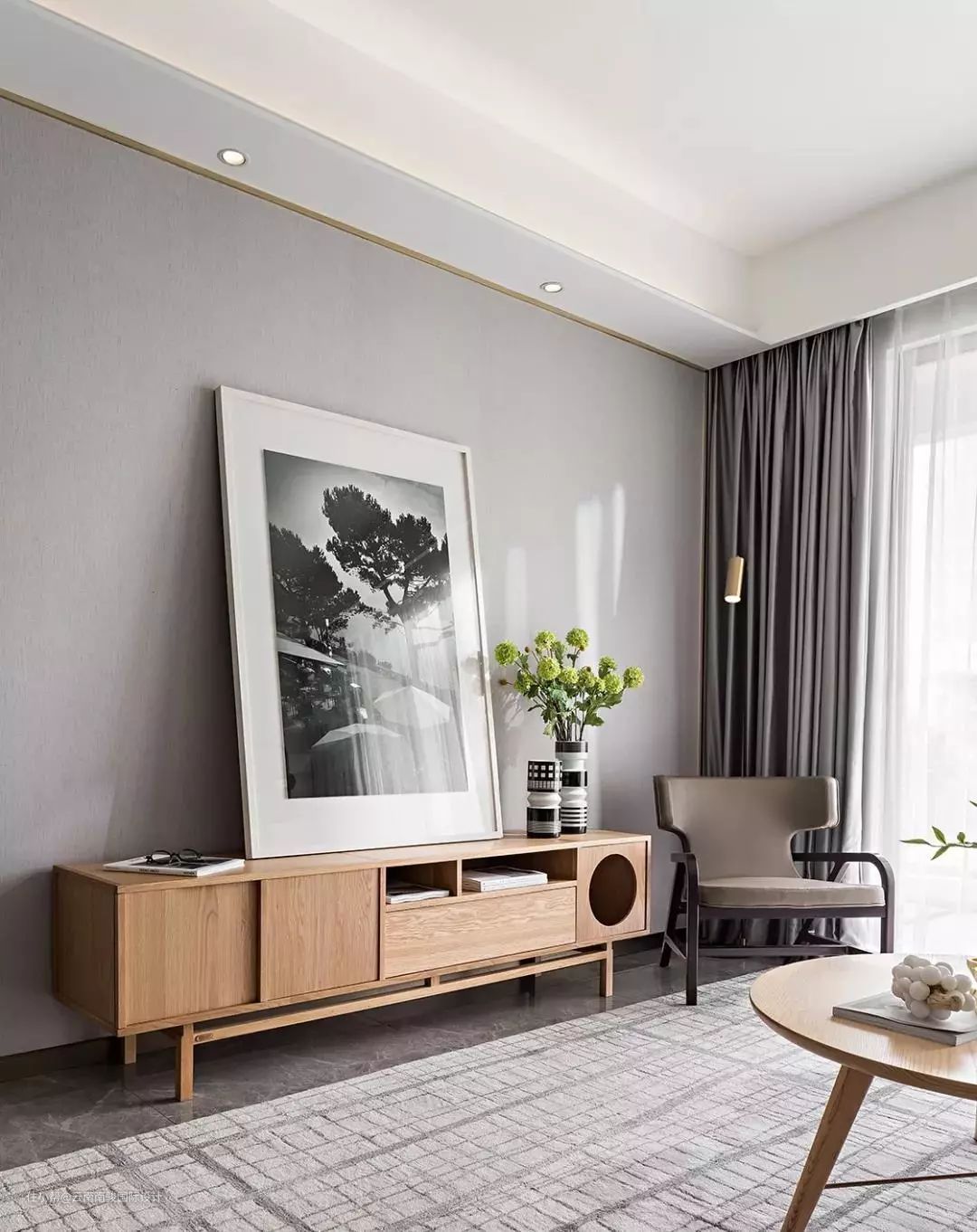 客厅的地面加了一款条形地毯,这样地面看上去也不会显得单调,浅灰色的绒布沙发不管是色调还是质感都是十分的舒适;沙发墙做了米黄色的护墙板并以铜条收边,很上档次;相比之下电视墙反而简单了,只是跟着整体墙面刷了灰色的涂料,放了一张原木色的电视柜,没有放电视所以就放一副喜欢的挂画作为装饰;