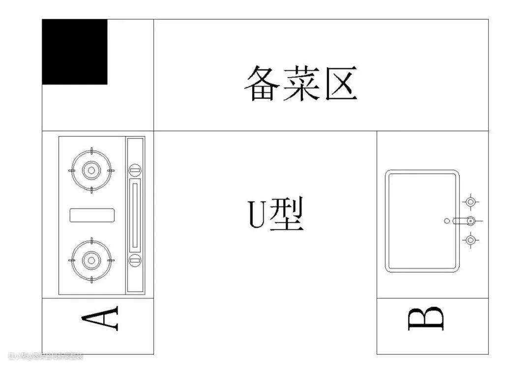最完美的厨房布局方式,动线顺畅,而且在同样空间可以有更长的一个台面。但是要做U型厨柜就需要长方形厨房,同时门开在长边并且不能有阳台门,不是所有厨房都适用。