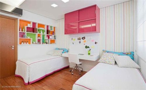 现在很多人家里都有两个宝宝,可是家里却只有一个儿童房,那该怎么办呢?看了这张图或许您就可以找到答案了。图中是一个双人儿童房,主人将两张小型的单人床分别依靠墙角摆放,书桌和吊柜式的书柜设计在中间,加上竖条的彩色壁纸,很有清新田园味道。