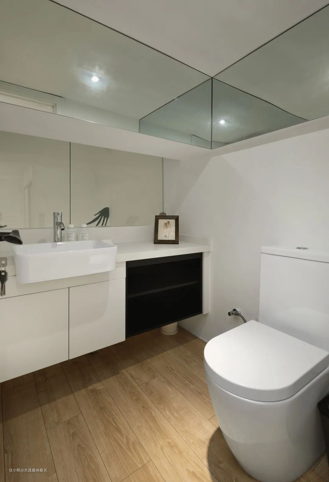 二楼的卫生间做了镜柜,以便收纳更多的物品,保持台面整洁,浴室柜空出下半部分的空间,避免卫生死角,可以有效的阻止浴室柜吸水受潮。