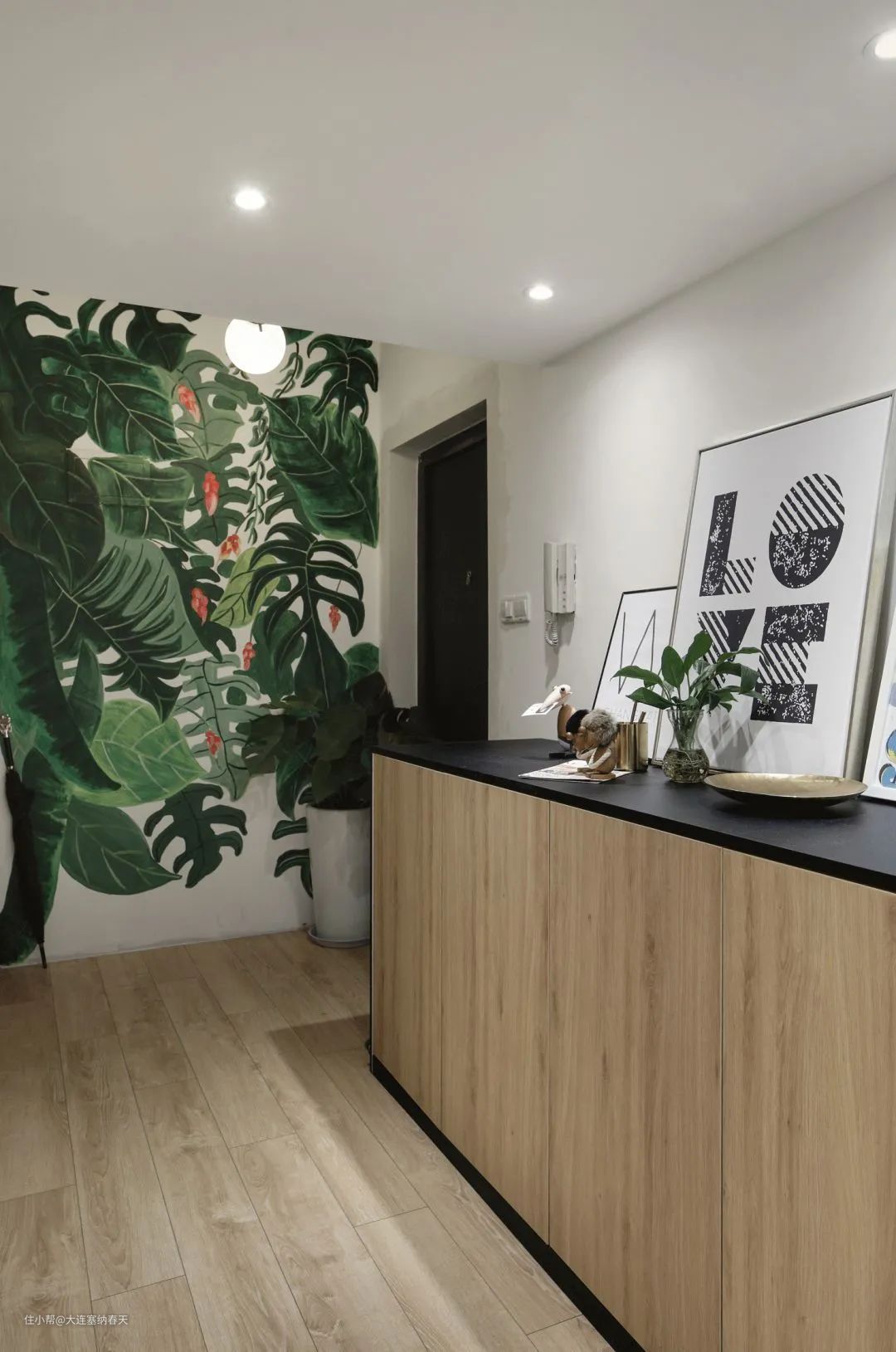 进门玄关绿意盎然的龟背竹墙绘,左手边摆放了一个矮鞋柜,不仅可以放鞋,柜面上还可以放些出门容易忘记的东西,如钱包、钥匙等,或是摆上几幅装饰画作展示也很漂亮。