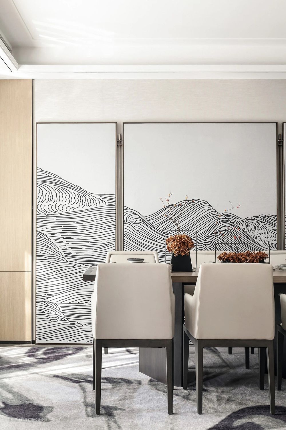 空间中看不见的气韵是设计追问的本质所在,东方意境的抽象山水,用屏风的形式呼应空间,建立秩序感与层次性,展开现代品质生活画卷中诗意栖居。