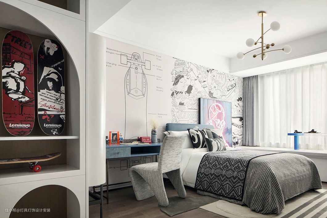 生命的律动,由滑板、墙绘、插画构成,营造动静结合的空间,空间是有声的,自由是无形的;设计对孩童生活场景与精神世界作细致的描绘,纯粹简净的日常定格在此间。