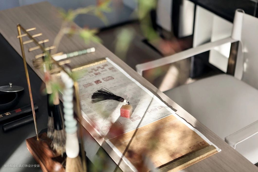 餐厅虚实柜体的错位设计,进退的重叠体块,配合紫砂色,家具皮革局部点缀,化繁为简,一剪枝,一蒿草,一书一盆栽,与室内建造美学相互呼应。