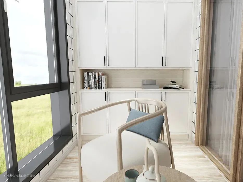 如果洗衣机不放在阳台,那阳台柜就可以完全定制为收纳柜+休闲区的结合,一侧设计到顶大柜,中间部分开放柜可以摆放小物件。下面设计一款悬空柜,空间优雅不厚重,摆上桌椅,就变身舒适休闲区。