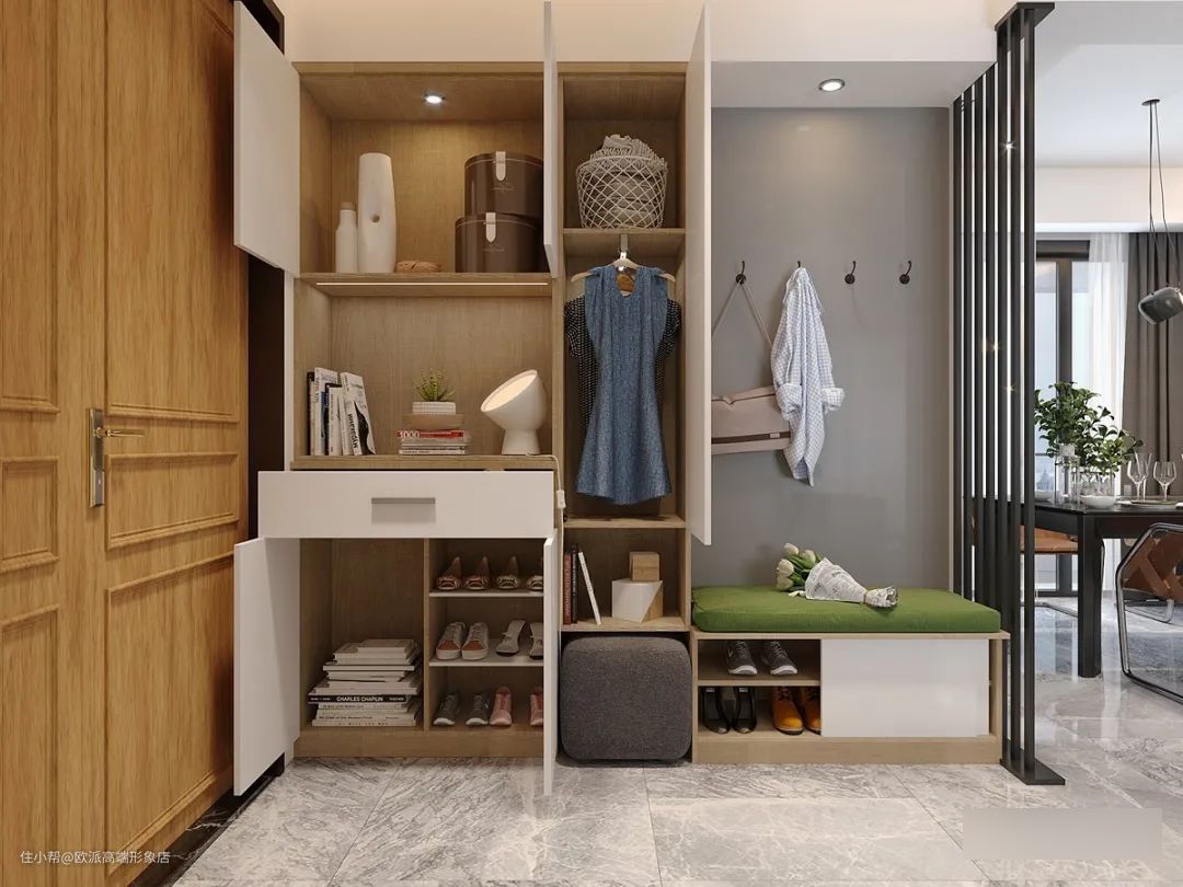 另外,穿过的大衣也可以放置在此区域,不用担心把灰尘带进卧室,具体做法是在玄关柜设置挂置区,外出要穿时在门口直接取用,尤其方便。