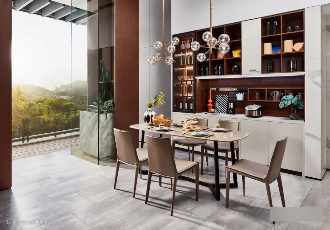 当餐厅作为厨房的后援空间时,进深要注意。比如餐边柜中部料理台需要放置1L的电饭煲,那么进深设计在38cm到40cm的深度为宜,还可做临时备餐台。上部的吊柜可做高,有利小家电的散热。不常用的锅碗餐具、米面粮油则是可放在下部的地柜。