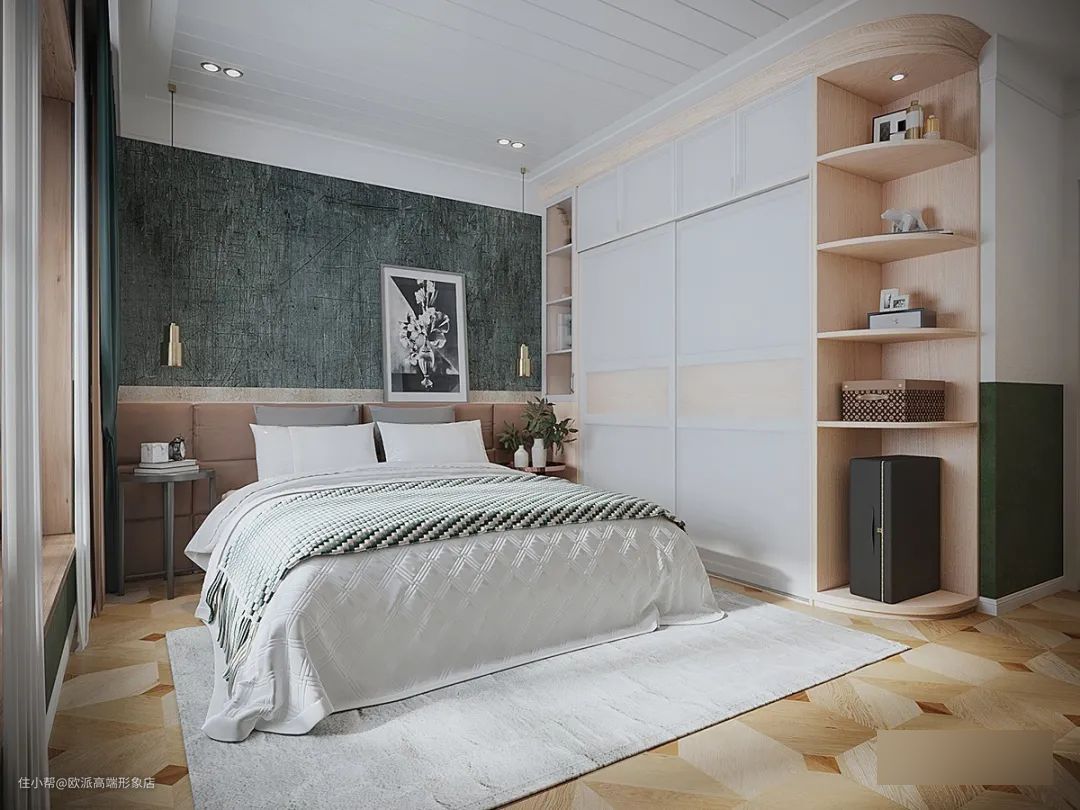 床的四周建议做出留空。床与墙面的空间要留出不少于50cm的过道,方便通行,如果床的一侧就是衣柜,那要保证床和衣柜之间的宽度要不少于60cm,方便衣柜门的打开和衣物的取用。