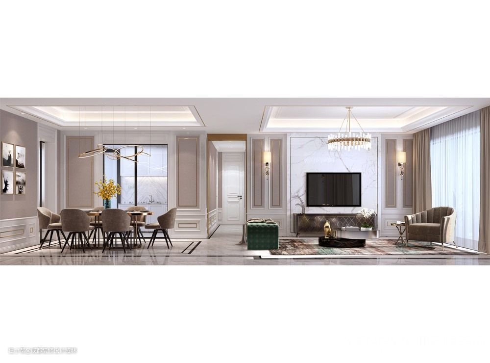 本案为现代风格,该房主退休夫妻不希望室内布局改动,保持原有户型,并且将一间卧室作为书房及多功能房使用,满足夫妻两人在家有安静的,紧凑私密的休闲空间。夫妇二人不喜沉闷单调的装修风格,遂将其设计为现代轻奢,带一些法式风!客餐厅墙面设计满面护墙板,石膏装饰线条,定制展示柜,既为整体空间营造丰富的视觉感受,也满足了夫妇二人对装修品质的要求!