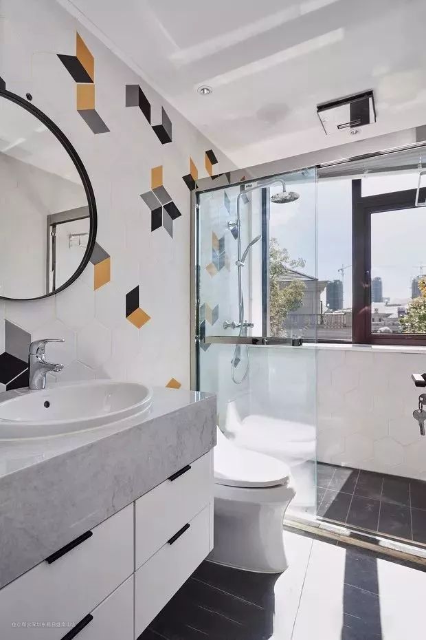 像一些比较小的卫生间,就可以选择缩减浴室柜的面积,然后把台盆给突出来,这样洗手台整体占据的面积也小了,淋浴房和马桶更好布置。