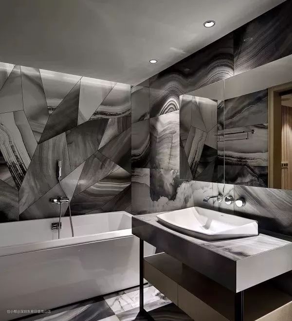 另一种就是和台上盆的做法相似,直接把台盆放在台面的正中,但底部会嵌入一些到台面里去,通常会形成一个弧形的角度,台盆也能借用到台面的力量。