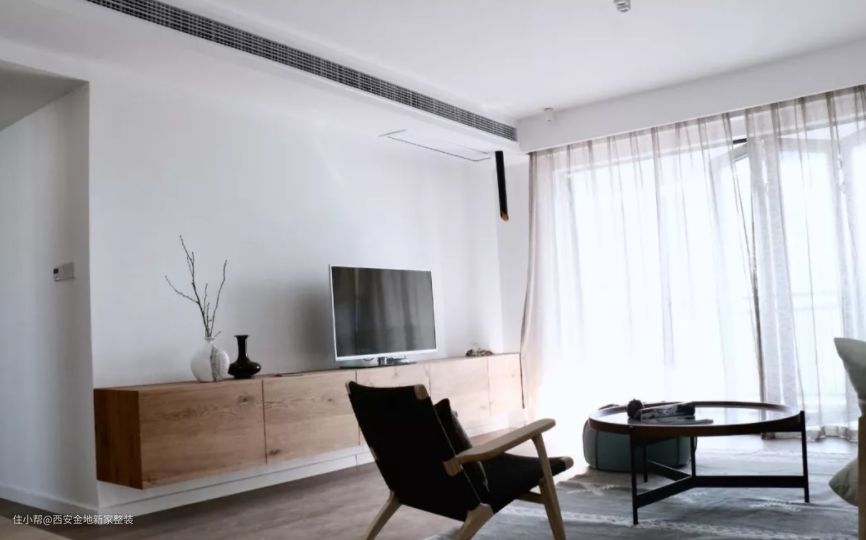 电视机背景墙是白色亚克力门,搭配桧木木饰面自然纹理,兼展示和储藏,又不影响视觉效果。和客厅的大飘窗自然过渡,整个客厅空间非常和谐。