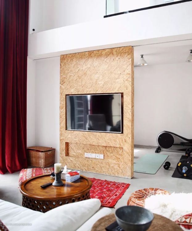 她家的电视背景墙是一面可推拉式的箱体,有需要就看,不需要就拉在一边。电视墙推开时,客厅和后面的家庭健身房连通,使整个空调更开阔。