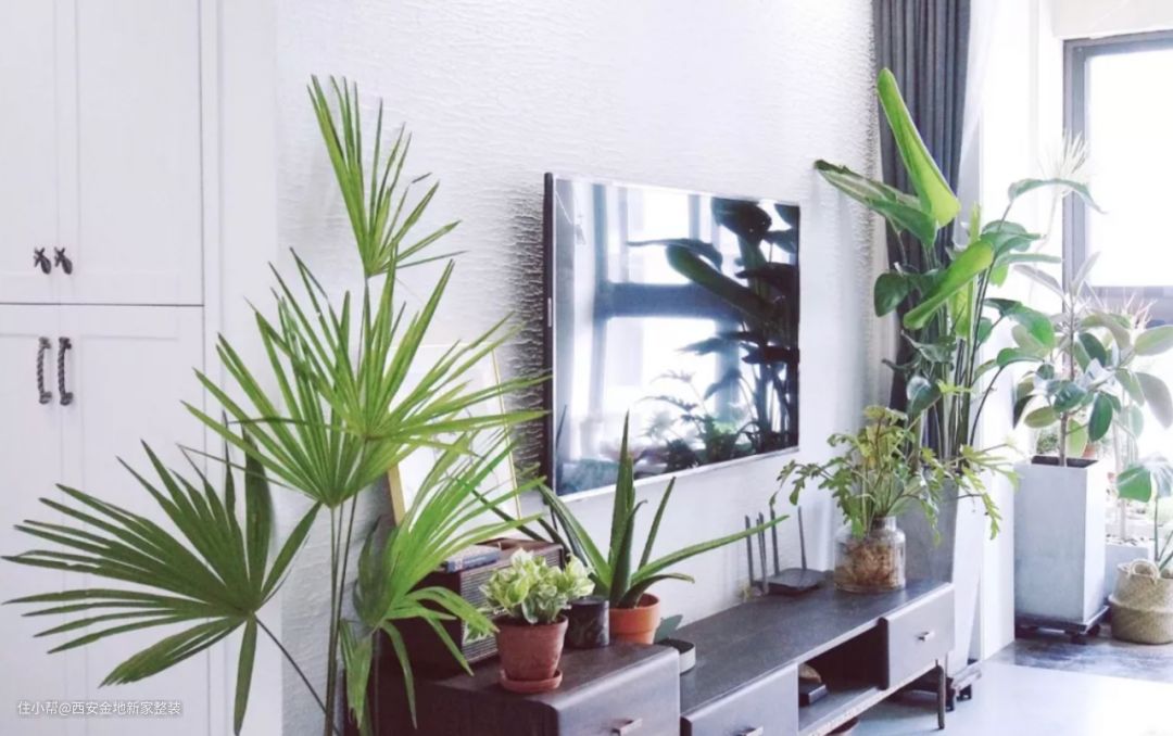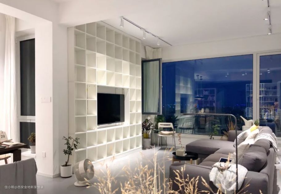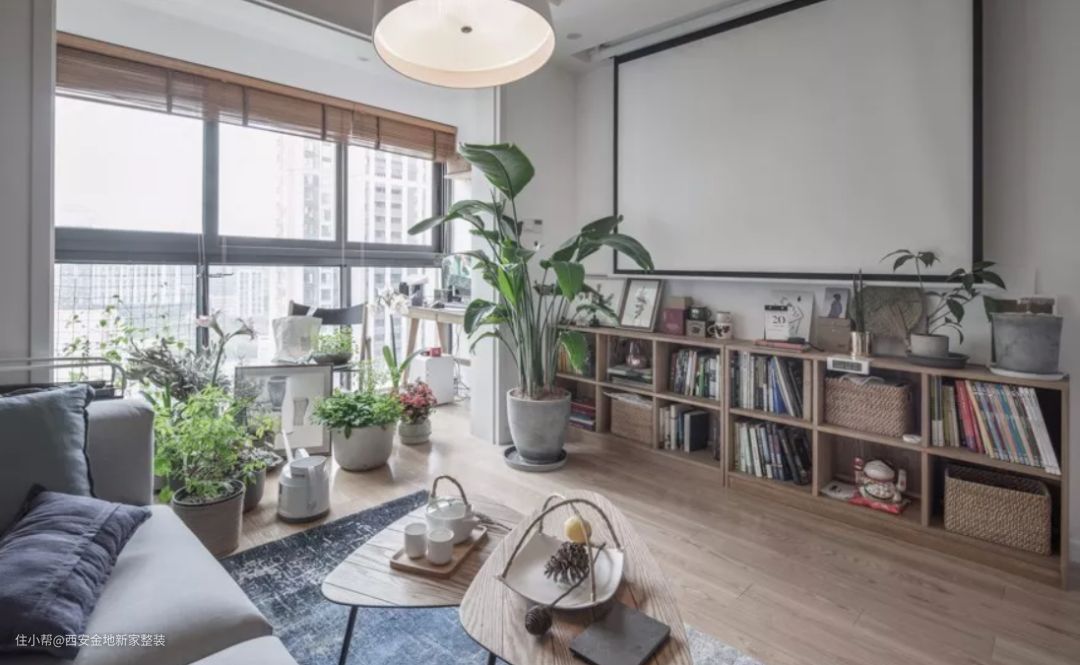 屋主家里有很多的绿植,为了避免过于“眼花缭乱”,背景墙的设计就要以简单为主。电视墙的吊顶为投影幕布预留了凹槽,不使用的时候可以收进去。幕布下方的实木格子柜,兼顾书籍与其他饰品摆放,不像传统电视柜般沉闷。
