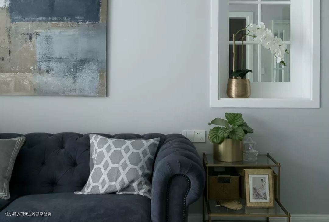 这个案例以大面积灰色为主调,用黄铜元素来提亮空间。带有美式田园味道的灰色电视柜,配上小面积白色背景,画龙点睛的是上部的板岩拼接,不同材质之间搭配出了宁静平和的氛围。