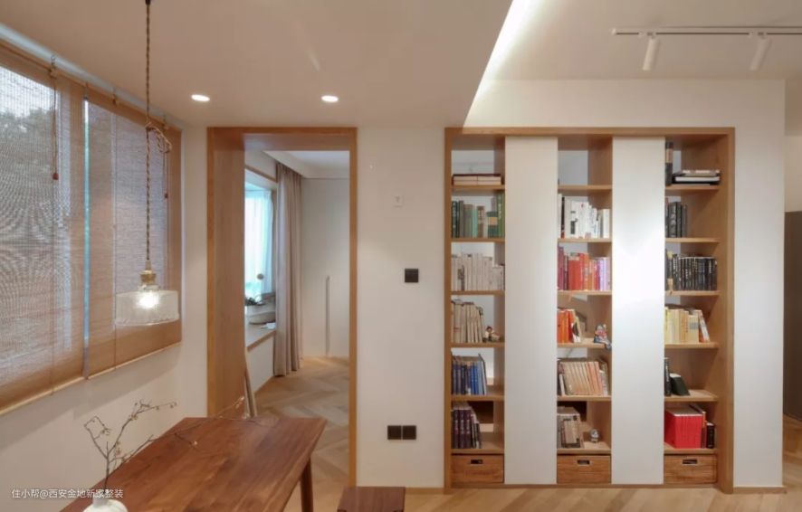 把客厅与卧室之间的墙面凿空加固,利用柱子空隙制作嵌入式橡木框体,做成400mm深的双层置书“墙”。客厅和卧室共享这一面“半透明书墙”,有一种隐隐约约的美感