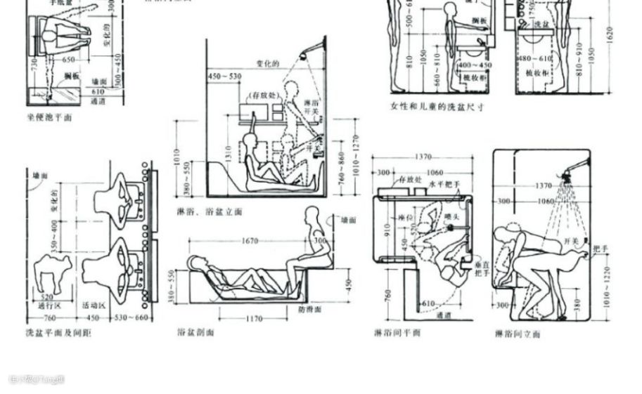 3:卫生间(卫生间主要就是浴室柜高度,长度,马桶的宽度长度,需要得空间大小多少合适,淋浴房的宽度,浴缸的尺寸。当然还有一些小的,比如毛巾架,厕纸架等,都需要符合人体工程学。)