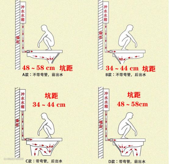 马桶和蹲便器排水PVC管为∮110mm,离墙坑距马桶有300mm和400mm两种,蹲便器分有存水湾、无存水湾、前排水、后排水,坑距如图