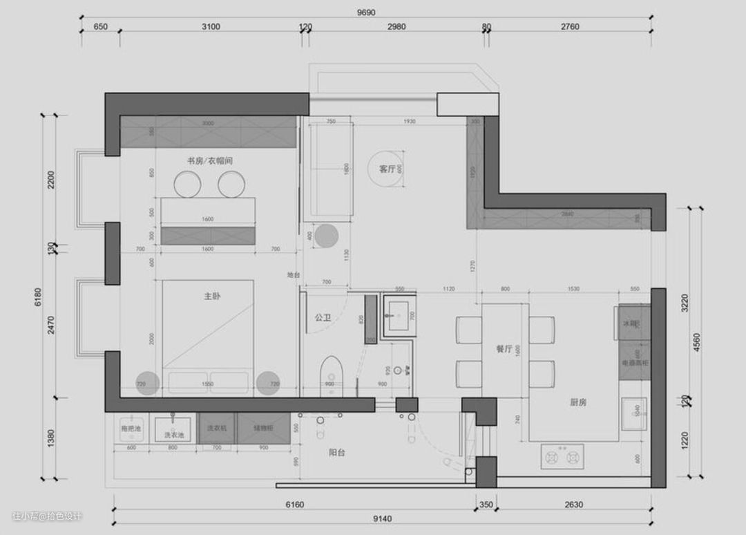 2、将主次卧打通合并,采用功能性来设计,解决办公及衣帽间需求。