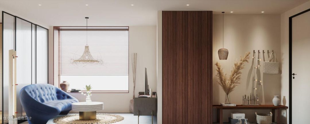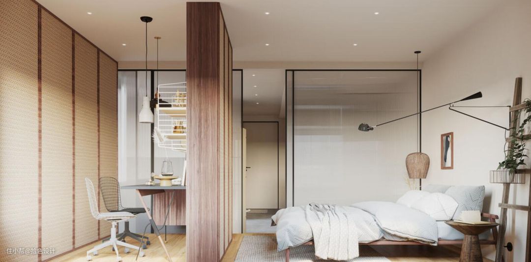 改造后的次卧主要以衣帽间及书房功能为主,为了突显出自然元素,衣柜门板也选择了竹席材质,看起来很有乡村感。而以书柜为隔断,既起到了空间划分作用,也不会影响到室内通透性。