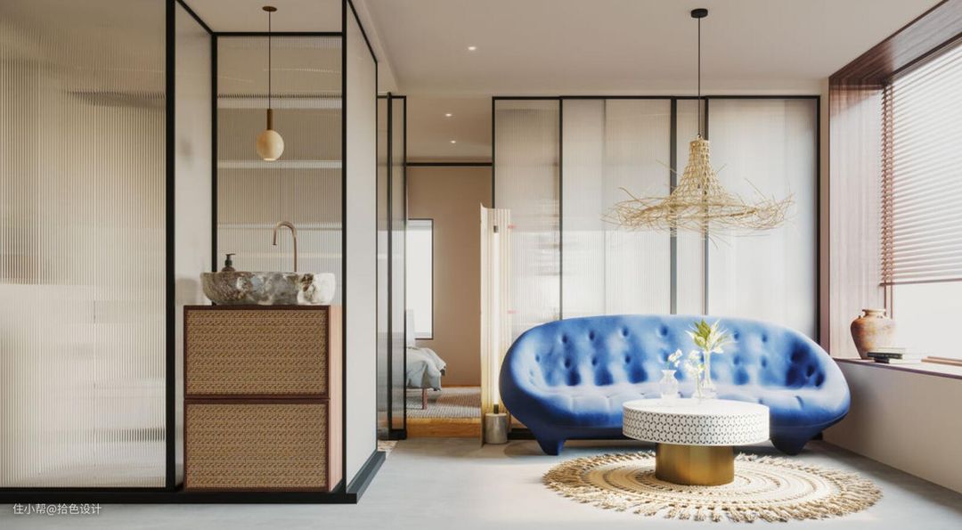当主次卧合并之后,墙体也是用玻璃来做隔断的,从而使室内形成全通透的结构。而一组蓝色的沙发,既给人一种非常舒适的环抱感,也起到了点缀空间的作用。同时,复古元素的利用,也让整个空间显得十分自然,且富有生命力。