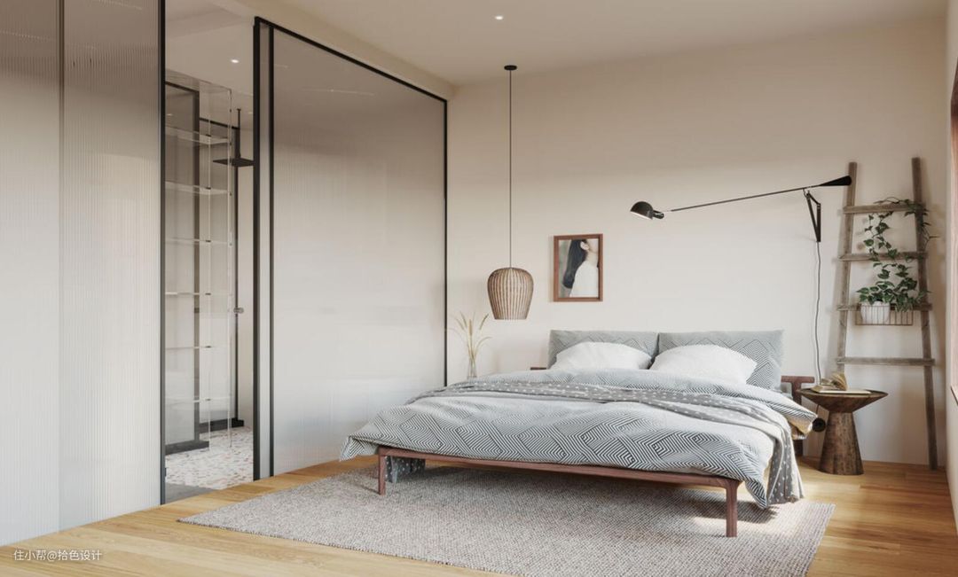 来到主卧室,以米黄色为基调,可以表现出空间的温暖,乡村元素的利用,则体现出了自然质朴感。仿佛一秒就能让人静下心来,享受生活的惬意。