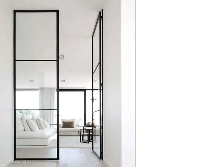 比如细框会显得更加精致,可以做成格子状,也可以只是围绕在门框上;玻璃可以选择完全透明的、毛玻璃,或者是网红长虹玻璃;平开还是推拉,随你喜好搭配选择。
