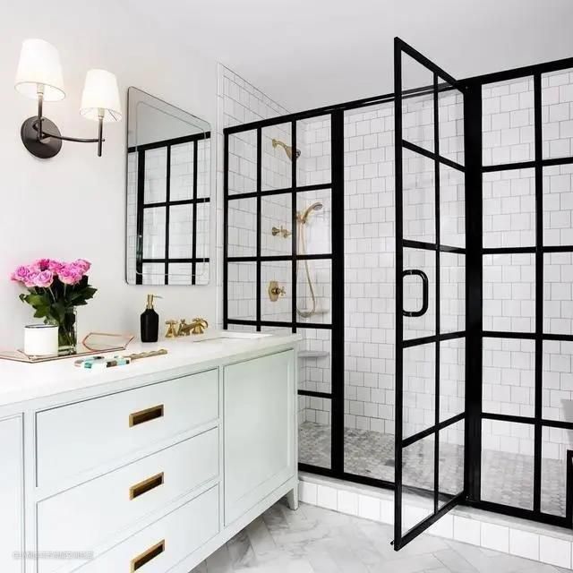 另外,黑框玻璃门还很适合浴室干湿分离,薄薄的一层玻璃就可以轻松隔断浴室的水渍,而且透光性要比屏风或是帘子好太多了。
