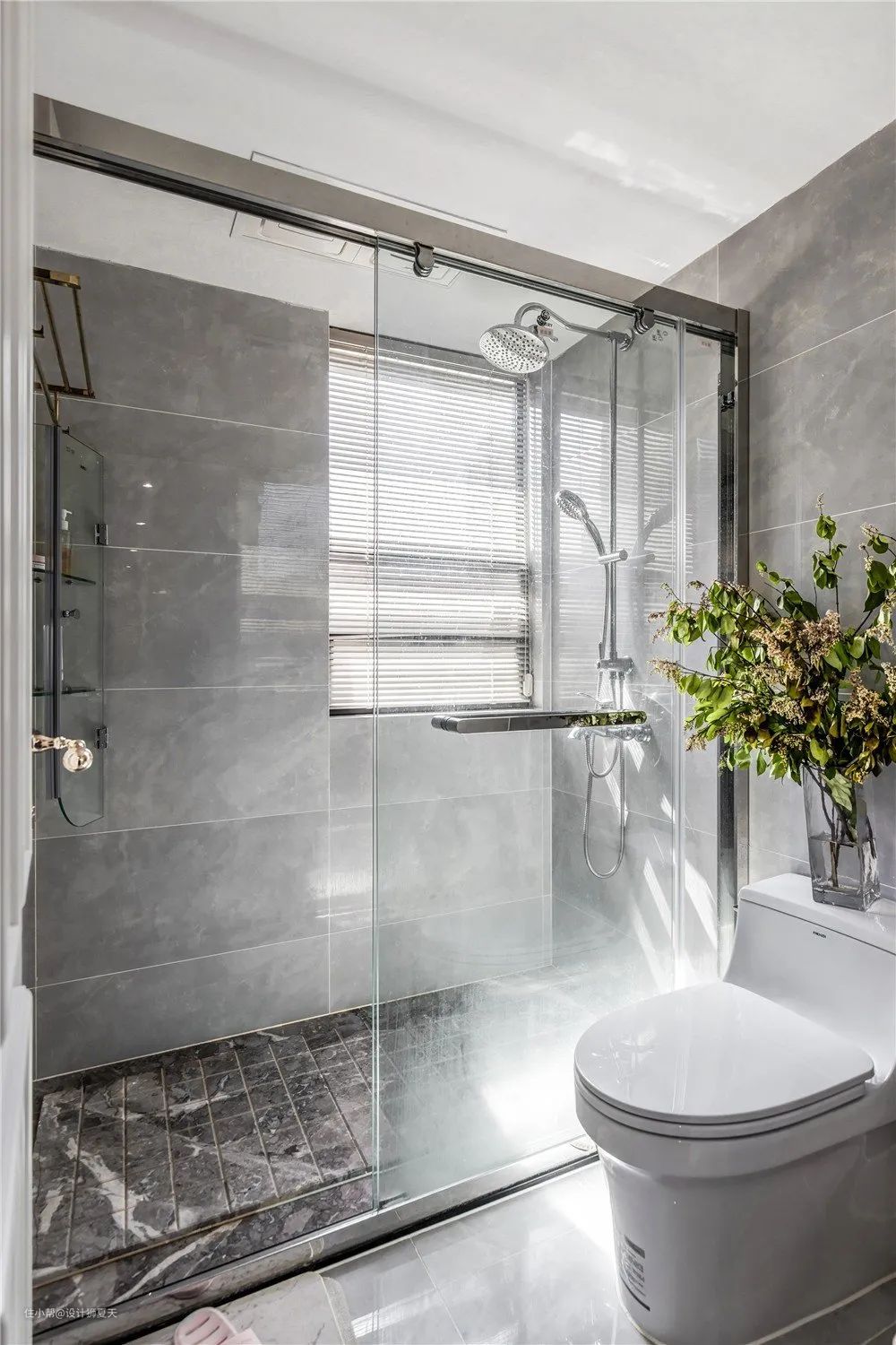 卫生间做了干湿分区,淋浴区地面石材拉槽起到防滑功能。