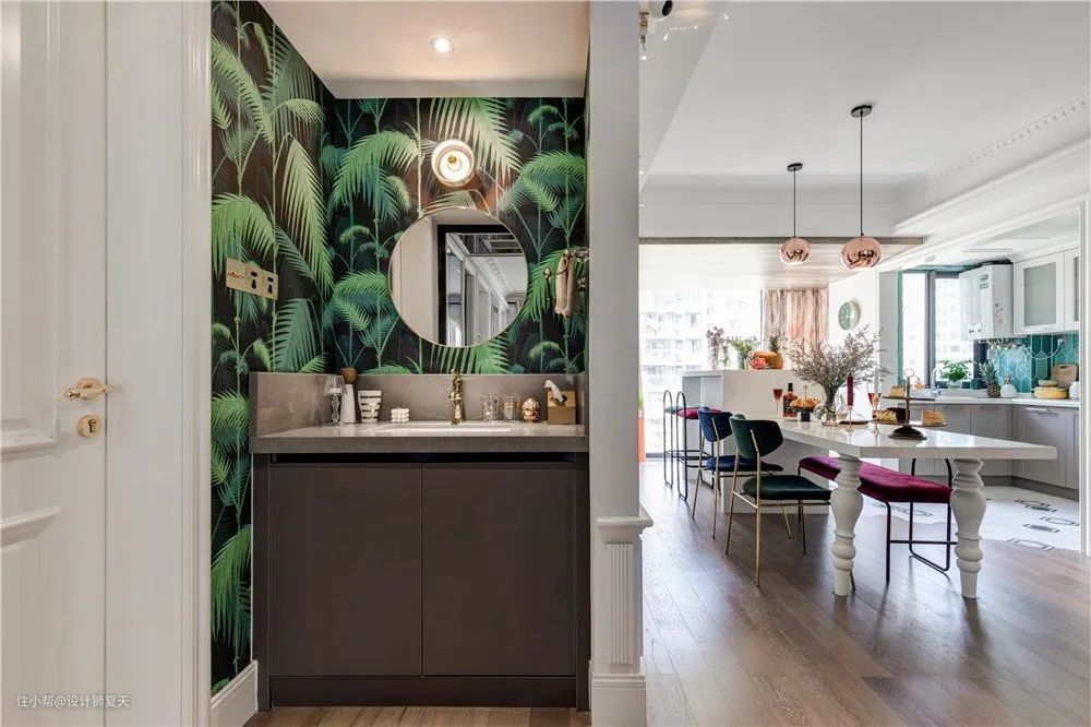 卫生间的盥洗区放在外面,可满足不同人的需求使用,绿叶图案的定制瓷砖让空间更加独特