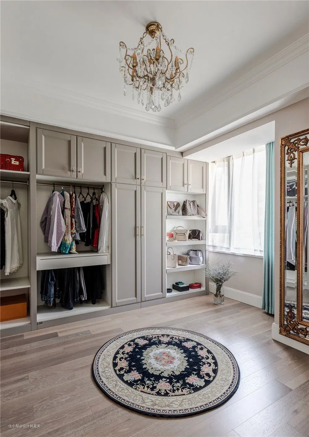 主卧旁边的卧室直接改为了衣帽间,这也是基于女主人工作性质(一位时尚编辑,兼职UP主),需要大量的空间来放置她时尚的衣物,衣帽间大部分为女主人所用。全屋定制的衣帽柜,延续了卡其色调,西式吊灯与毛绒地毯为整个空间增添了柔和和宁静。