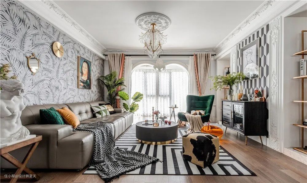 客厅选择了极具经典的美式深卡其色皮艺沙发,背景挂件金色的不锈钢细节配合茶几与灯具的黄钛金,提升了软装氛围的轻奢质感。抱枕橙黄色,绿色系的布艺,让空间在颜色和氛围上能有些柔和的跳动,也不会过于浮夸。客厅的过道墙面选用了一幅建筑装饰画,规律性的拱门图案给了整个空间不一样的故事性趣味以及张力,也是现代与复古的一次精妙碰撞。