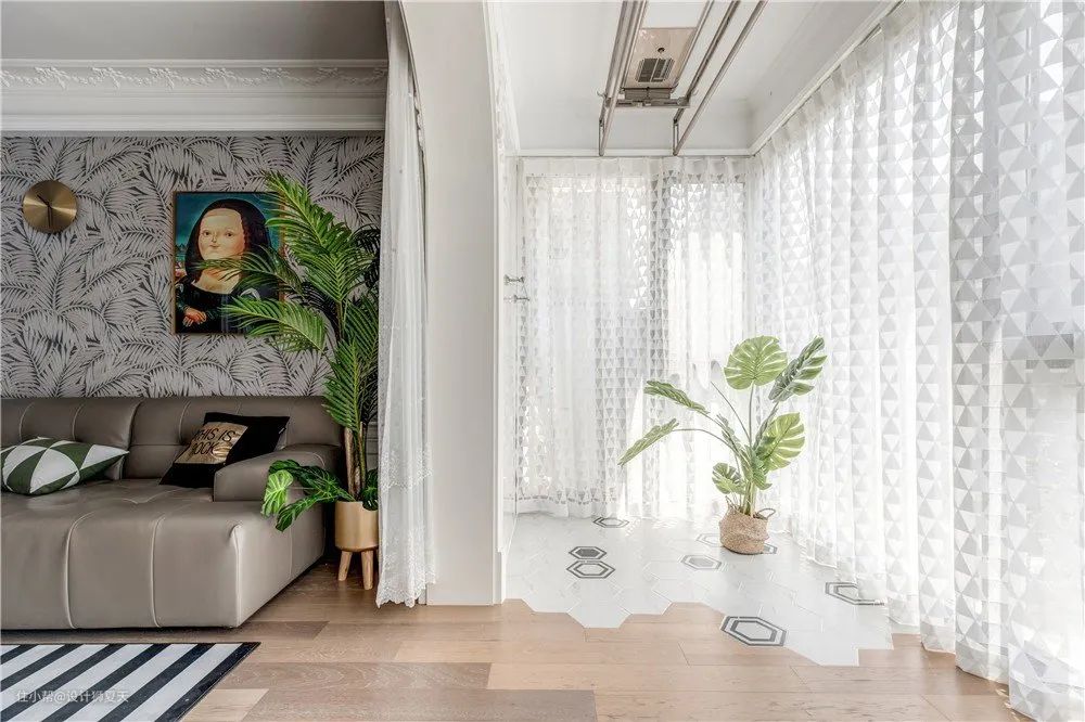客厅外的景观阳台地面选择了地板与六角瓷砖硬碰,不仅把阳台显得更加精致,也避免晾晒衣物打湿木地板的问题。