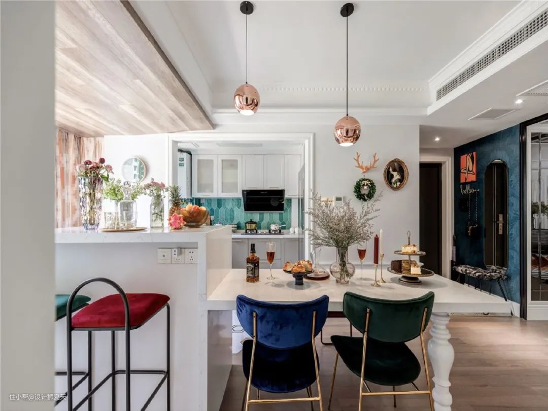 餐厅采用中岛台与餐桌结合的形式,增强使用功能的同时,餐桌与餐椅餐凳样式的选择上。为空间增加了一点趣味和神秘感。