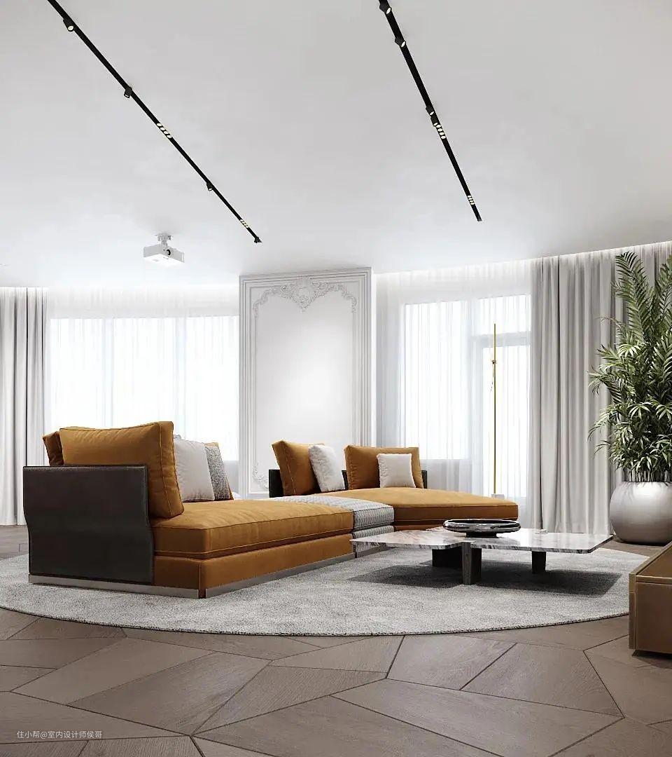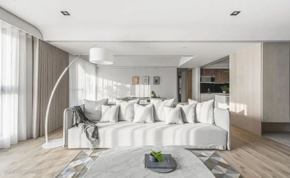 从地面到墙面,再到天花,遵循"墙浅地中家具深、墙中地深家具浅",颜色依次变浅,会给人营造出和谐自然的层次感与空间感,同时不会显得头重脚轻。
