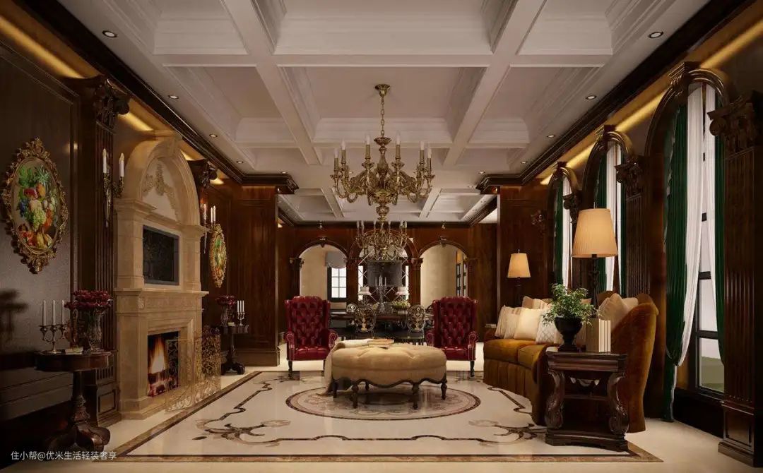 用井字型假梁不仅可以弱化横梁,还能丰富顶面的造型,通常美式风格比较常见。