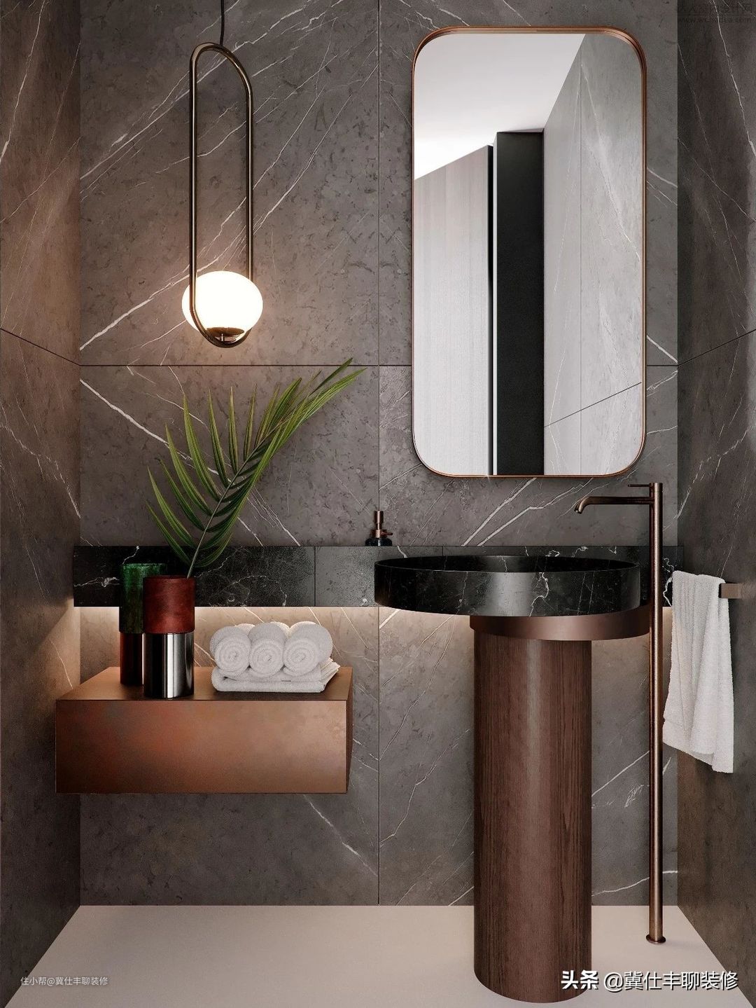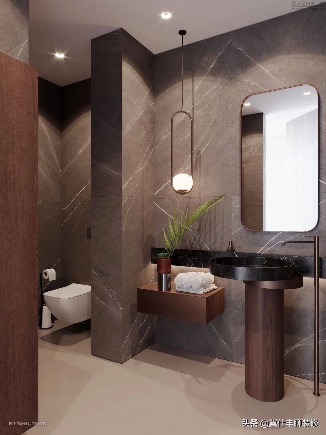 ▲ 次卫地面铺设微水泥,墙面则铺设深灰色大理石瓷砖,定制柜和洗手台仍以胡桃木色进行饰面,高级感也非常突出。