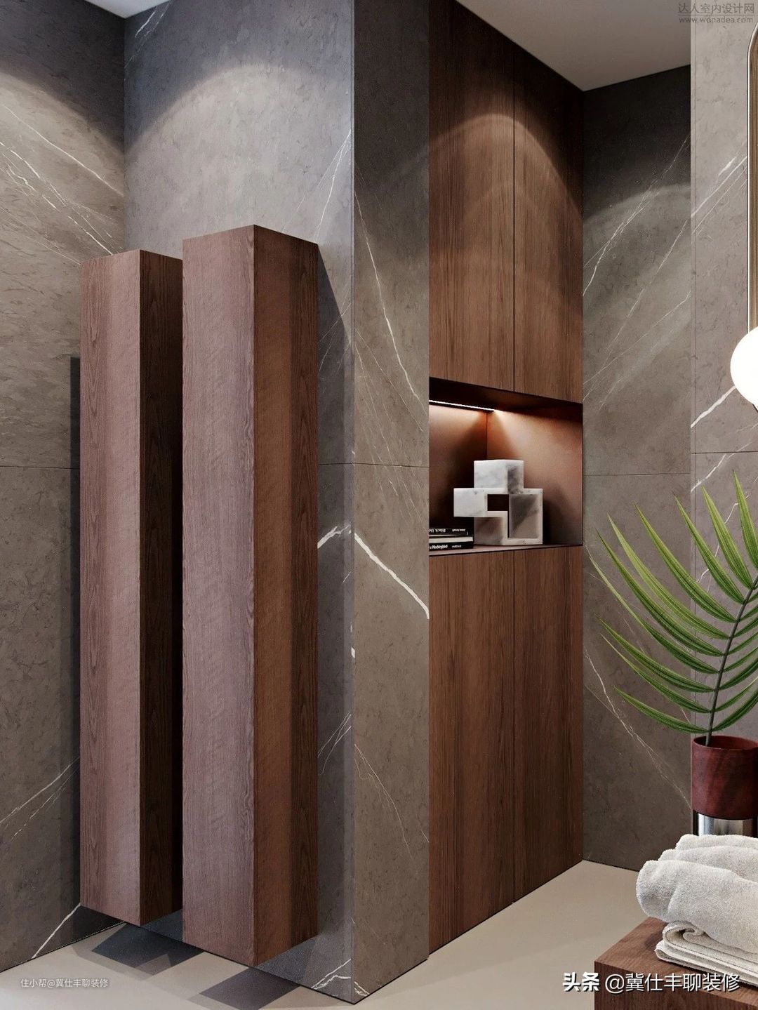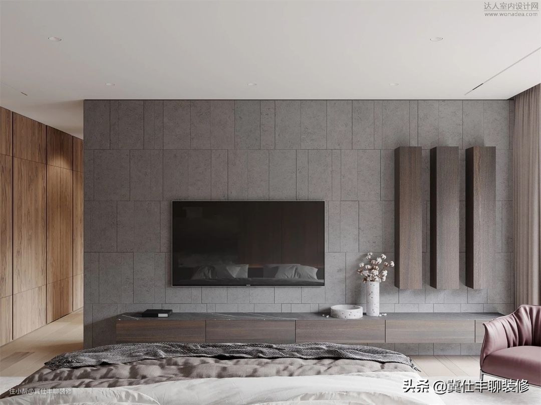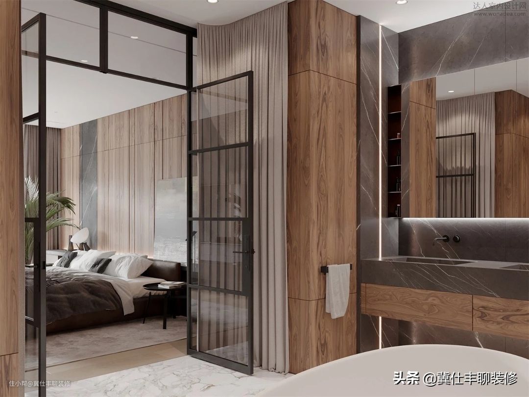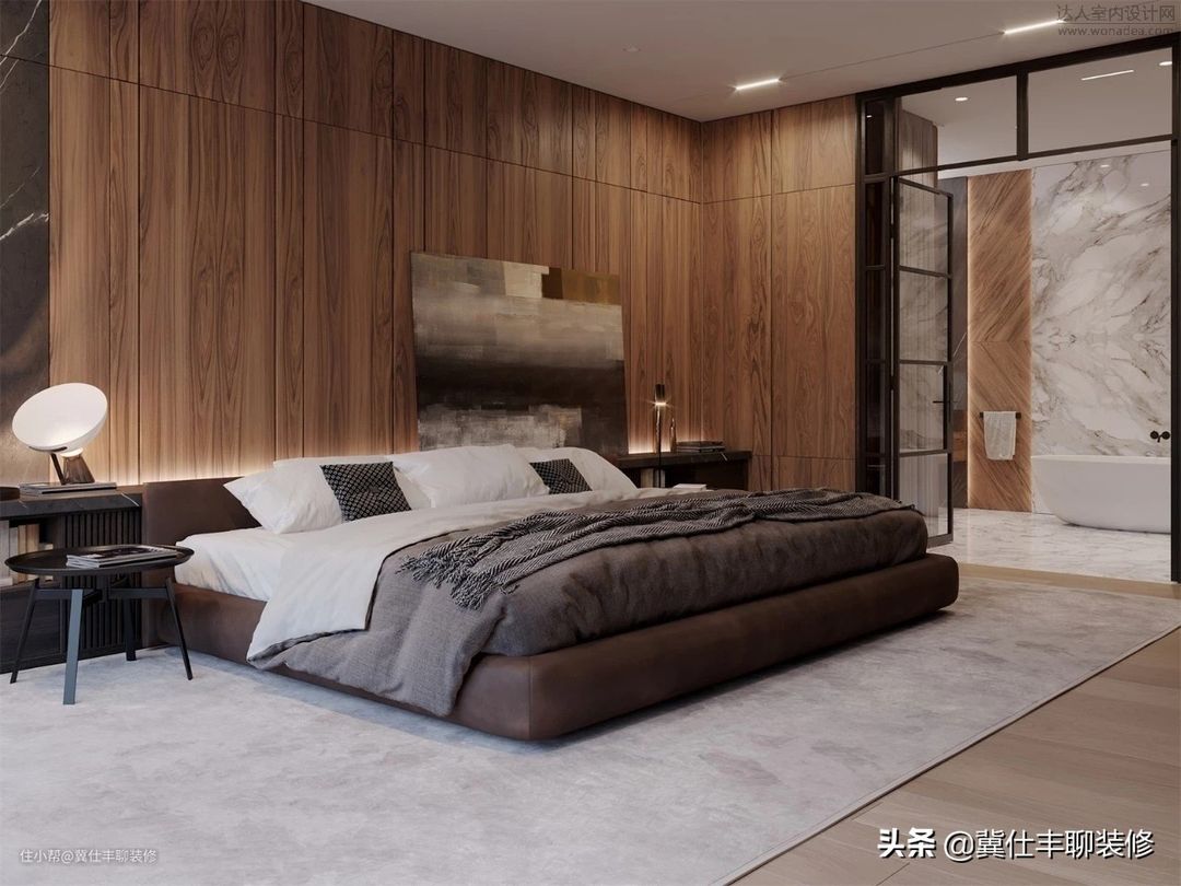 ▲ 主卧也没有增加新的装修材质,依旧是胡桃木色的护墙板和深灰色岩板组合,电视背景墙选择了中灰色水泥砖。主卫则仍以胡桃木色饰面板和深灰色岩板进行组合,地砖和浴缸背景墙则以浅色大理石瓷砖装饰。