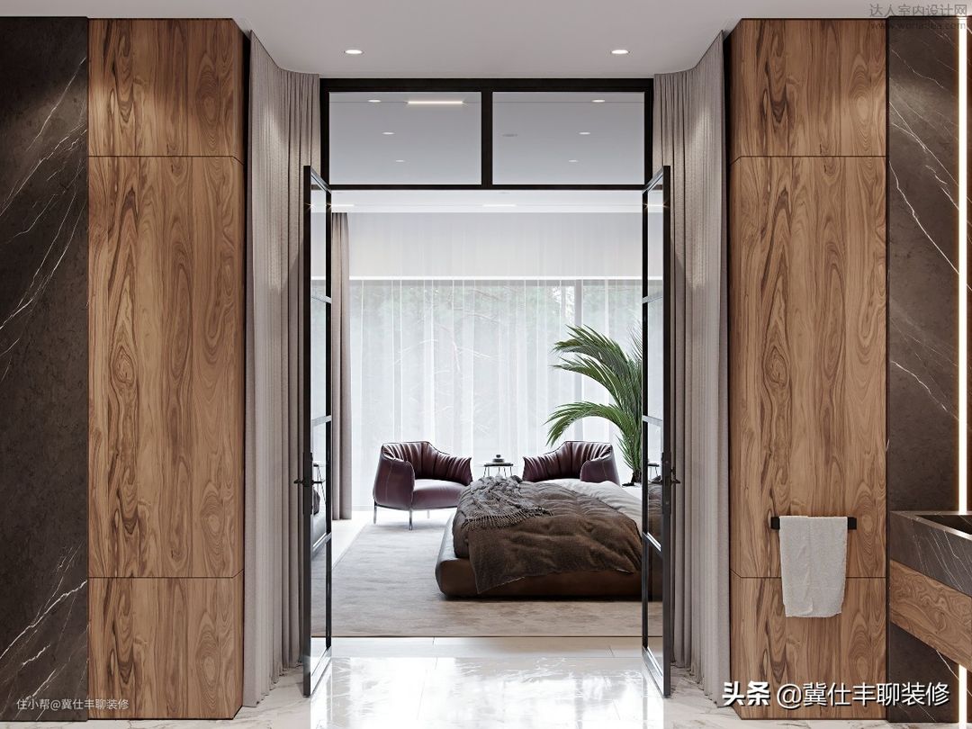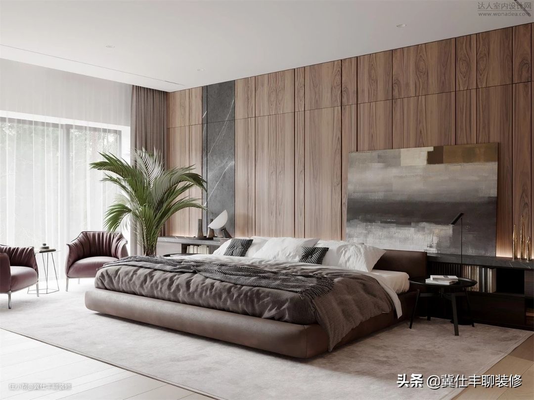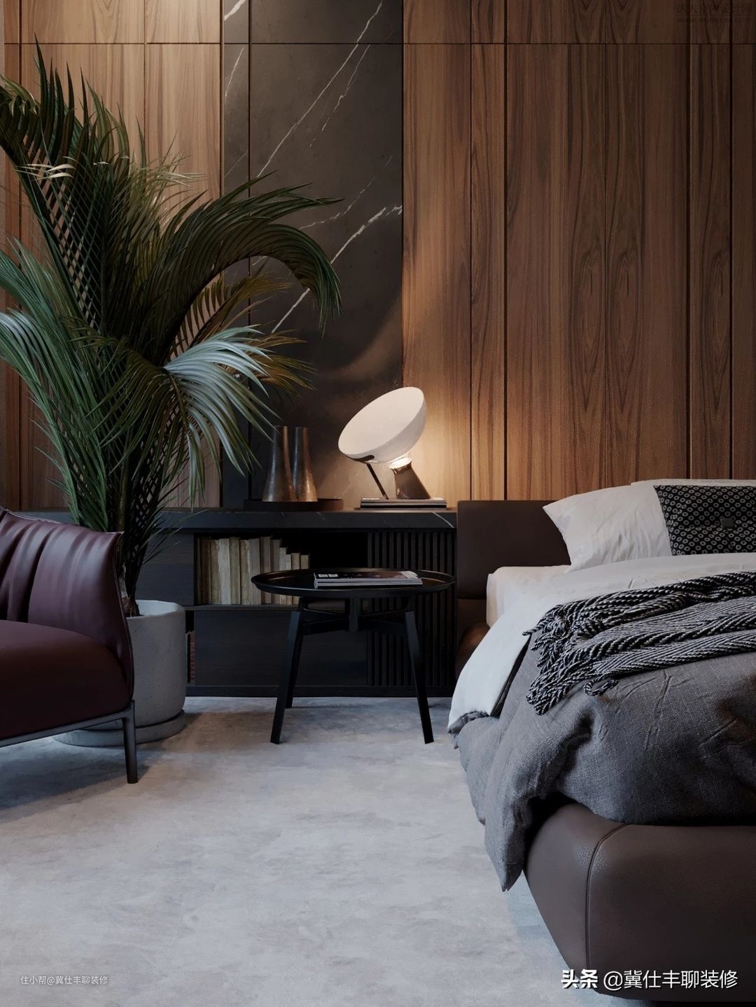 ▲ 主卧也没有增加新的装修材质,依旧是胡桃木色的护墙板和深灰色岩板组合,电视背景墙选择了中灰色水泥砖。主卫则仍以胡桃木色饰面板和深灰色岩板进行组合,地砖和浴缸背景墙则以浅色大理石瓷砖装饰。