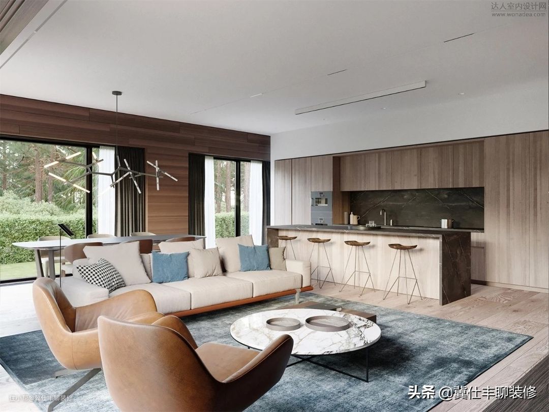 ▲ 客餐厨区,地面铺设原木色地板,墙面铺设胡桃木色护墙板和同色地板,橱柜也选择同款门板,深灰色岩板被应用在电视背景墙、厨房墙面和岛台,简单的材质,却体现出不简单的品质效果。